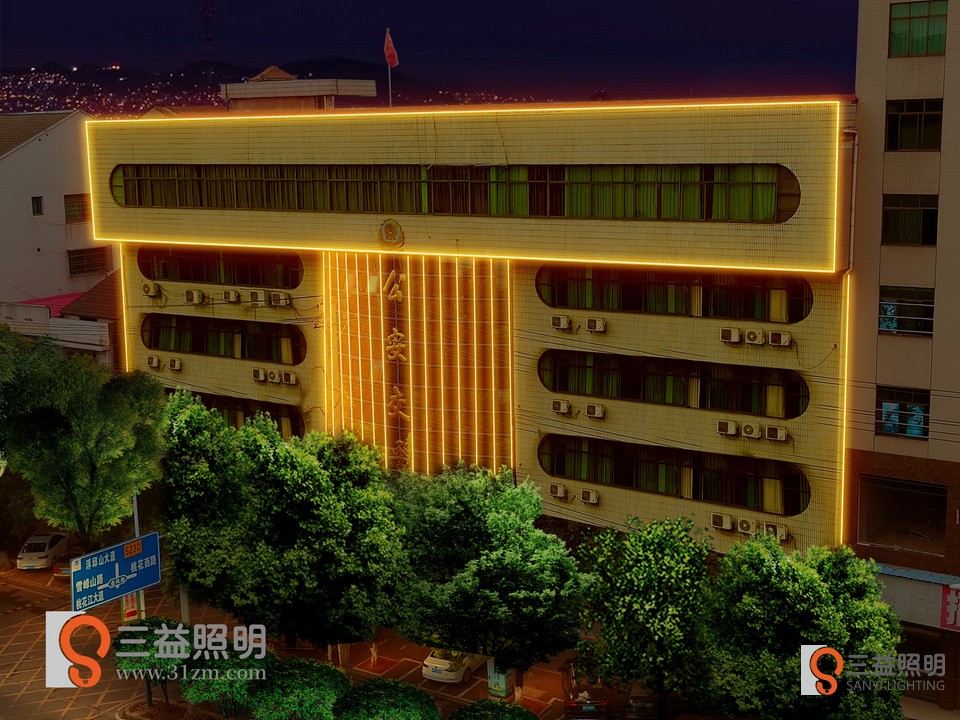 桃江縣公安交警大隊(duì)、事故入處理中心外墻燈光設(shè)計方案,采用線條燈勾勒大樓輪廓。